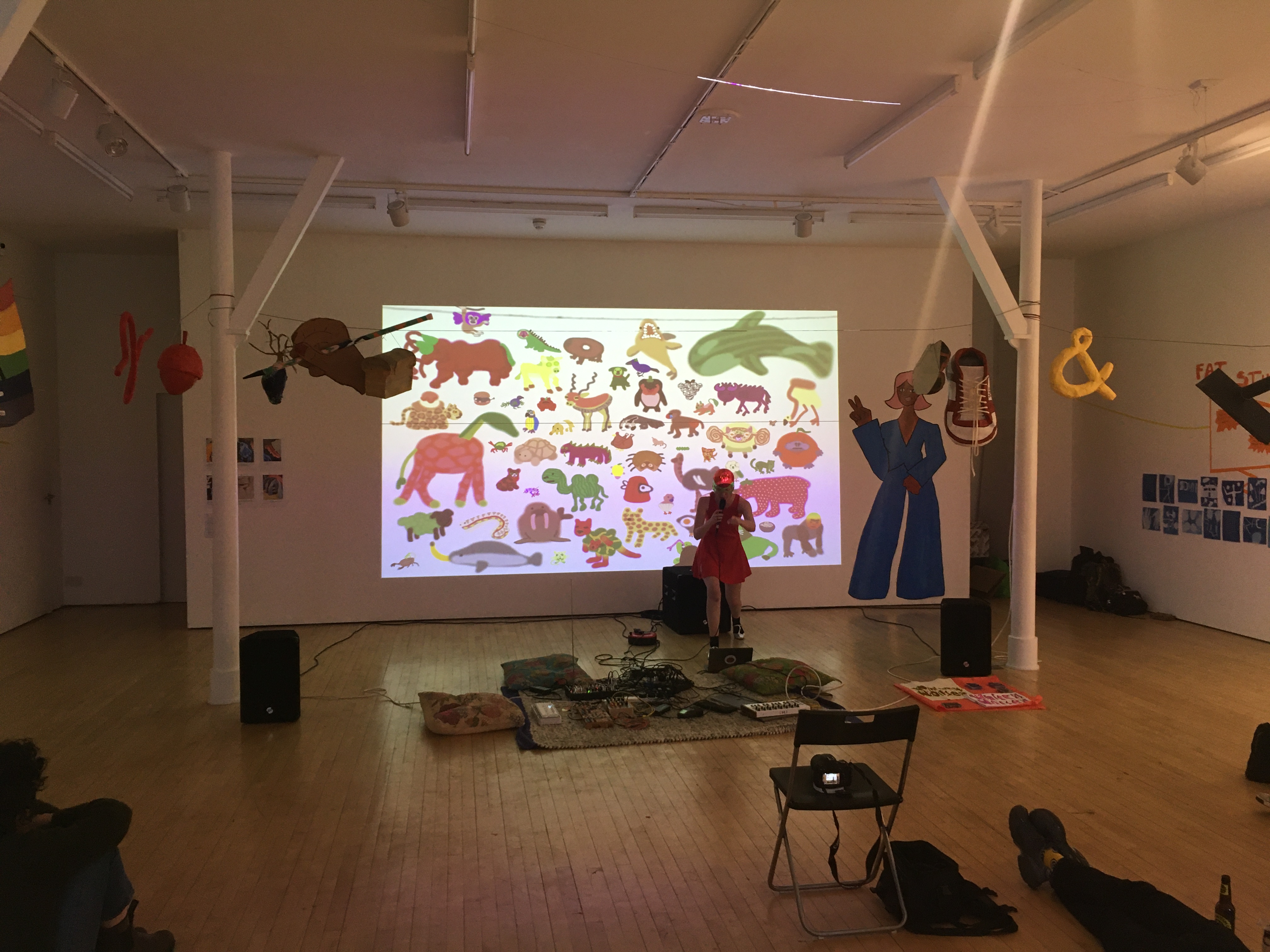 After the market we ran a short pop up style White Noise session with 4 performances. @zhao_jiajing_ performed on modular with an antenna controlled modular synth using field recordings, granular synthesis modular processing. @jesse.th0mps0n presented a piece in which he collaborated with a tree in his garden. He used a special microphone to record the fluids passing through the tree. @rhubarcode performed as Annibles with an animated interactive show in which she played with language, illustrations and animation in a humorous way. Finally @bleepsworld did a short improvisation on the cocoquantus lofi looper.